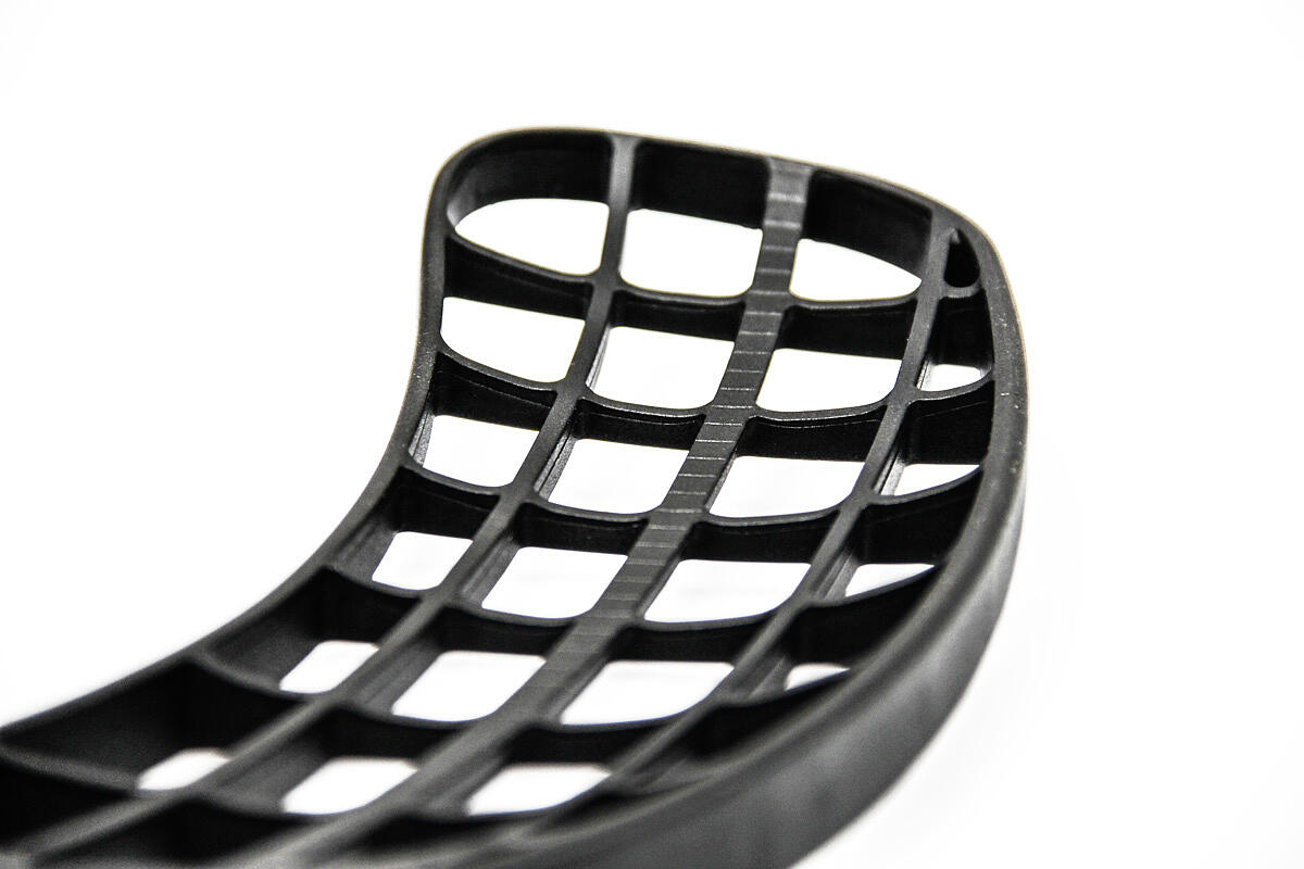 The upper rib is offset, which prevents the ball from escaping from the blade, and the nose is more pre-curved.