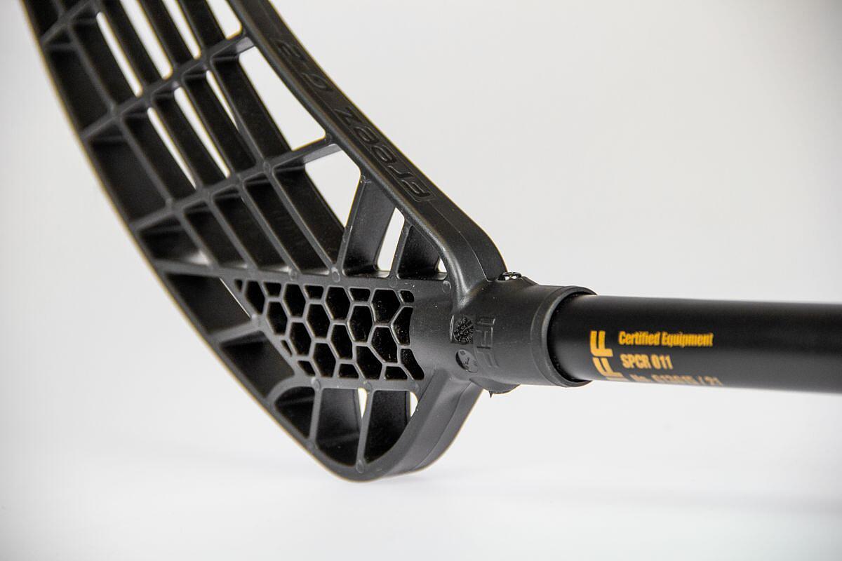 G-2 blade on Freez Spear 29 We can't fail to mention the new product, the second generation Freez G-2 blade in Medium hardness (medium hard blade). The medium-grained blade guides the ball perfectly, the clever horizontal continuous ribs help the ball leave the blade with maximum precision, and when shooting or passing, the ball is not "torn off" by any interfering protrusions - the clean line of the continuous ribs has undergone extensive testing and exceptionally complements the great feeling of the game. The backhand side of the blade is dominated by a special reinforcement in the neck area in the form of hexagons arranged in the shape of a honeycomb. Simplicity - low weight. The ideal combination!