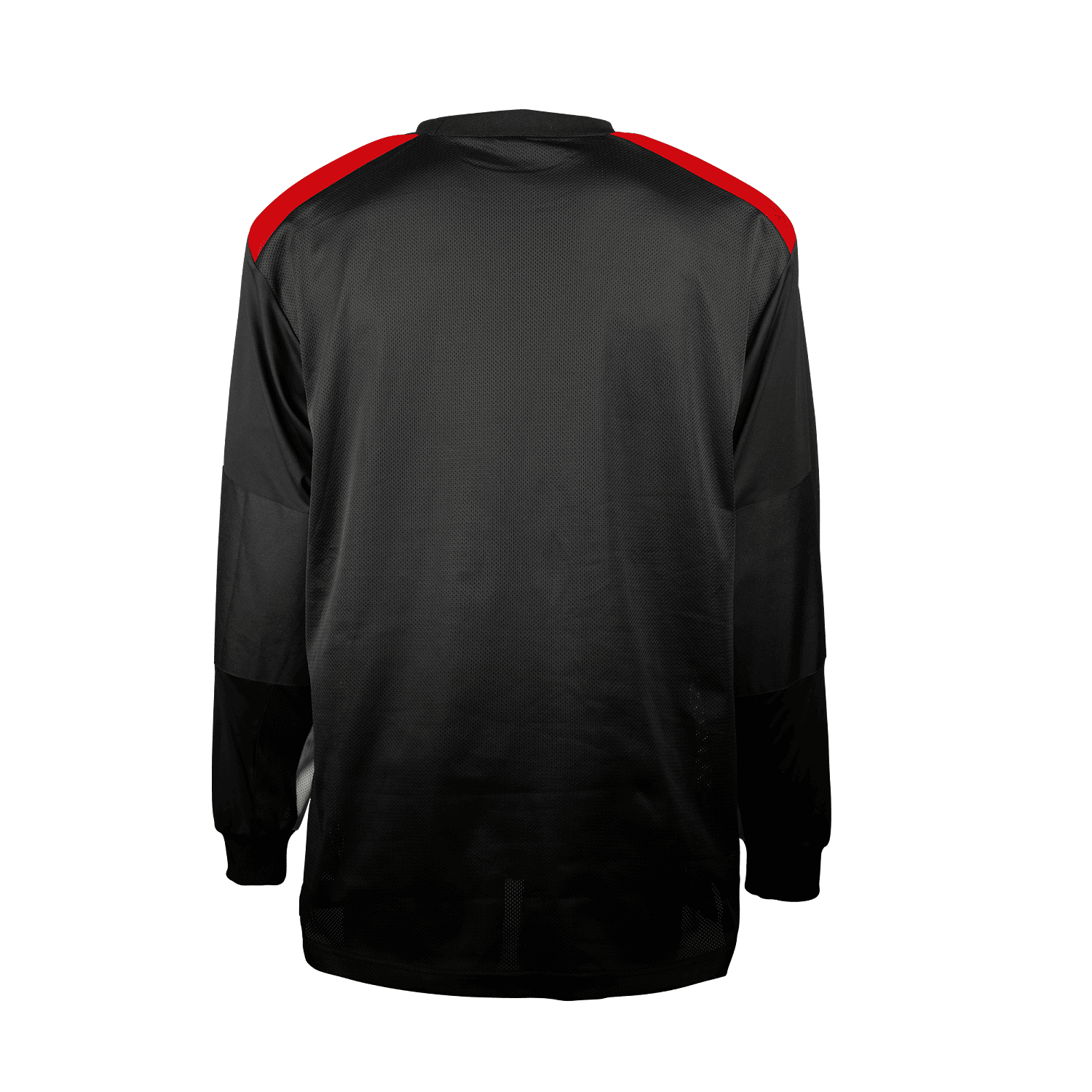 - Salming floorball goalkeeper jersey, React series, wide cut, padded shoulders, Cordura elbow reinforcements, breathable mesh on back, black-red variant