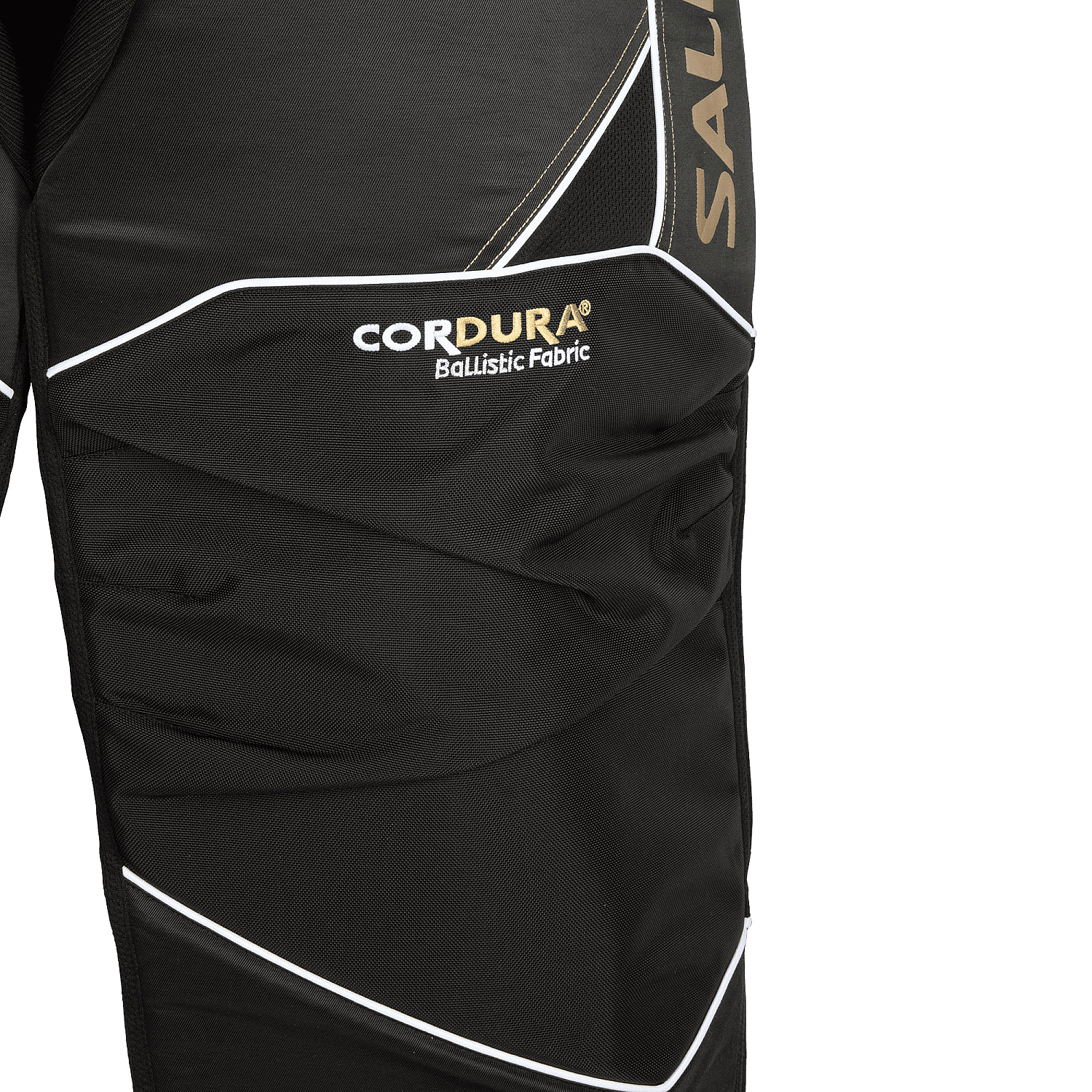 Goalkeeper pants for floorball goalkeepers from Salming, React series, wide cut, Cordura knees, cushioning material on the front of the thighs, high-quality YKK zippers on the legs, black-gold variant