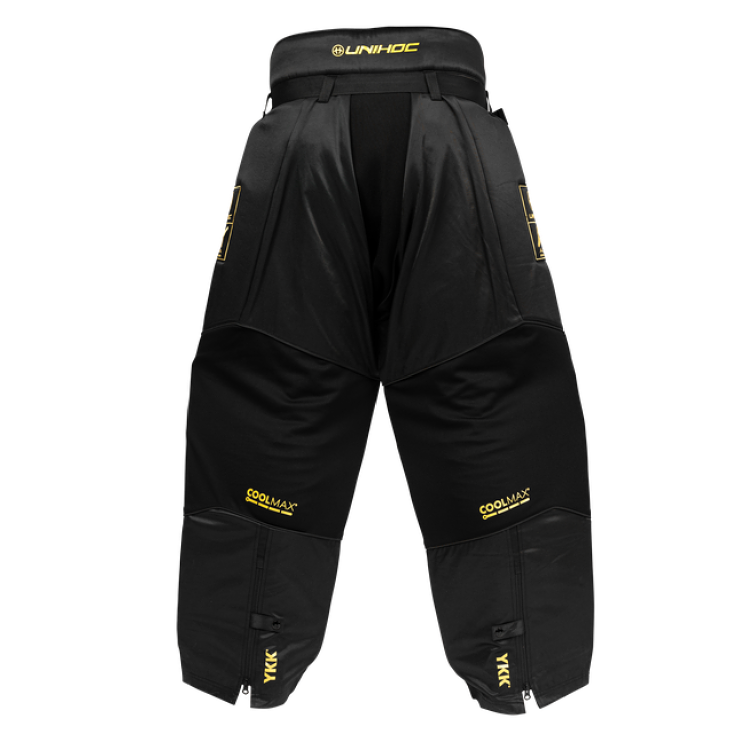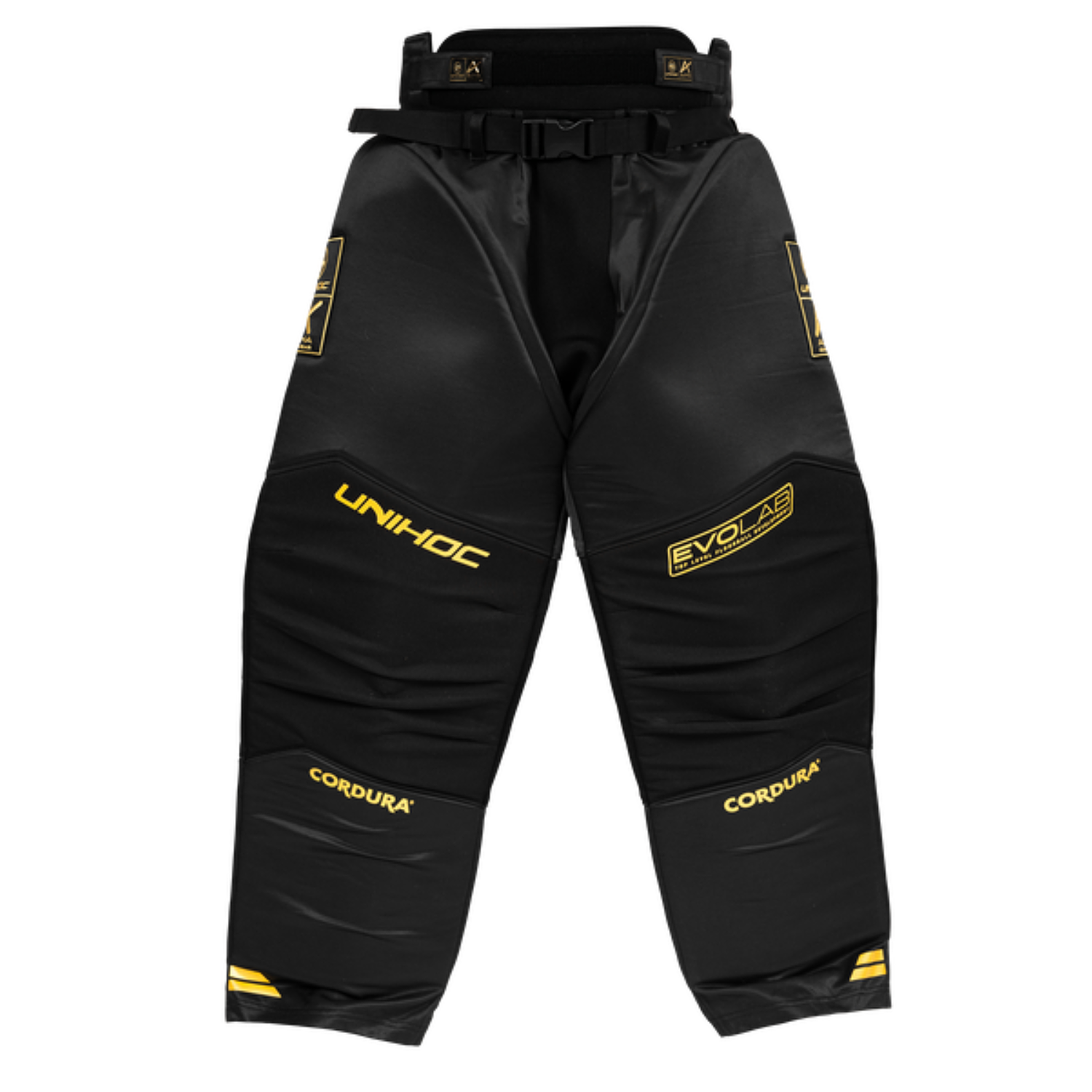 Unihoc ALPHA EVOLAB is a top model for floorball goalkeepers, which was developed in close cooperation with the Swedish national team goalkeeper Jon Hedlund. The pants are made of the best materials available on the market to achieve absolute top quality and offer long service life. The main material is COOLMAX fabric, which is super breathable and helps to quickly remove moisture to the surface of the fabric, where it evaporates. The entire front of the pants and the sides are extra strong padding, which provides the goalkeeper with the best possible protection. The knee areas are made of a very strong fabric called CORDURA, which offers perfect resistance for this highly stressed area.